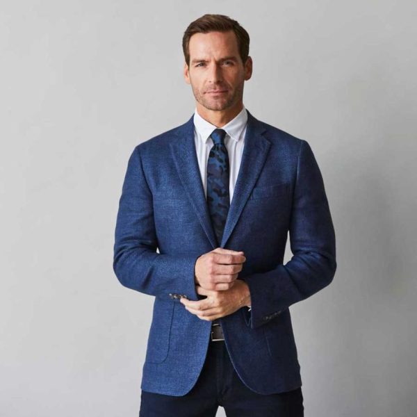 - Sophisticated indigo twill linen/cotton blend blazer with timeless appeal
