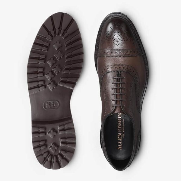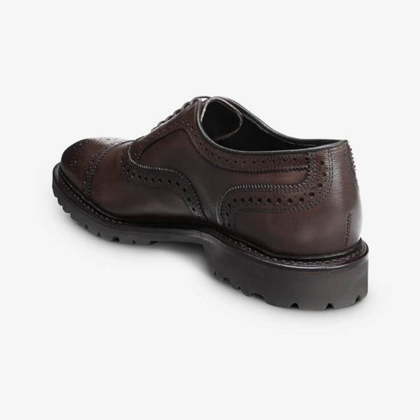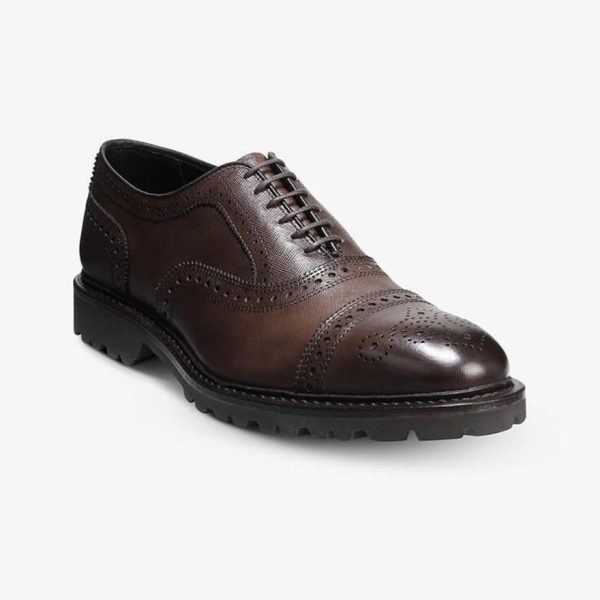 - Six-eyelet cap-toe balmoral with brogue perforations and toe medallion